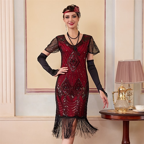 Anni Ruggenti Anni 1920 Lunghezza al ginocchio Abito Flapper Maniche corte Il grande Gatsby Paillettes Frange Scollo a V Costume Per donna Natale Carnevale Mascherata Festa a tema retrò Danza
