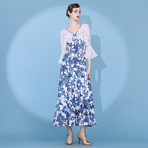 abito da ballo da sala da donna con fiori, scollo a V, volant, maniche a campana, abito da valzer, abito da competizione standard moderno, blu