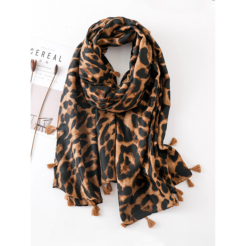 Women's Leopard Print Tassel Scarf – Soft Lightweight Oversized Wrap/Shawl with Fringe, Chic Boho Style for Fall/Winter, Casual Outfits, Office, Travel Gift Giving