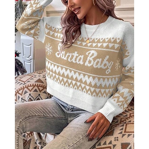 Damen Weihnachtspullover Fair Isle Pullover Pullover Elegant Mode Niedlich Einfarbig Grafik Weihnachtsmann Rundhalsausschnitt Gestrickt Druck Langarm Normale Oberteile Stricken Weihnachten Outdoor