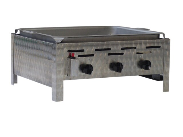Gastrobräter, 3 Brenner je 4,5 kW, mit Grillrost und Stahlblechpfanne, B 650 x T 530 x H 270 mm, inkl. Gewerbedruckregler u. Schlauchbruchsicherung
