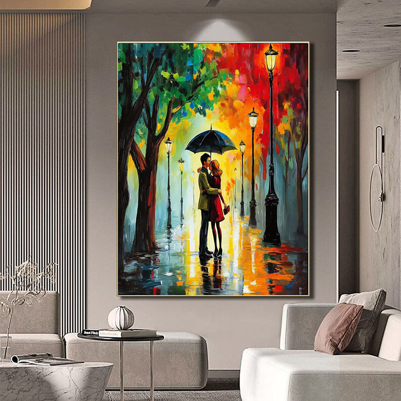 Christmas gift oil painting Handmade Romantic City Night Walk Couple Under Umbrella Canvas Impressionist Street Scene Evening Rainy Street Art Painting Modern Home Decor