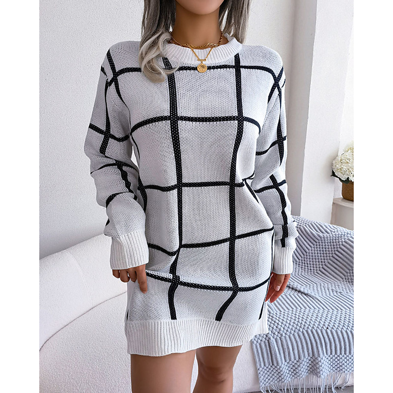 Women's Mini Dress Sweater Dress Fashion Modern Daily Holiday Going out Regular Fit Plaid Long Sleeve Crew Neck White Green Khaki Spring Fall Winter