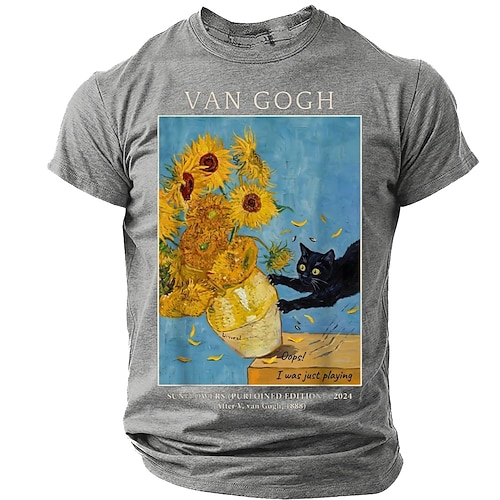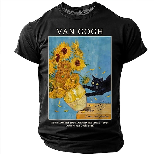 Maglietta da uomo con stampa grafica divertente di un gatto nero e girasoli di Van Gogh, stile impressionista, regalo per amanti dei gatti, edizione rubata, maniche corte, casual, abbigliamento