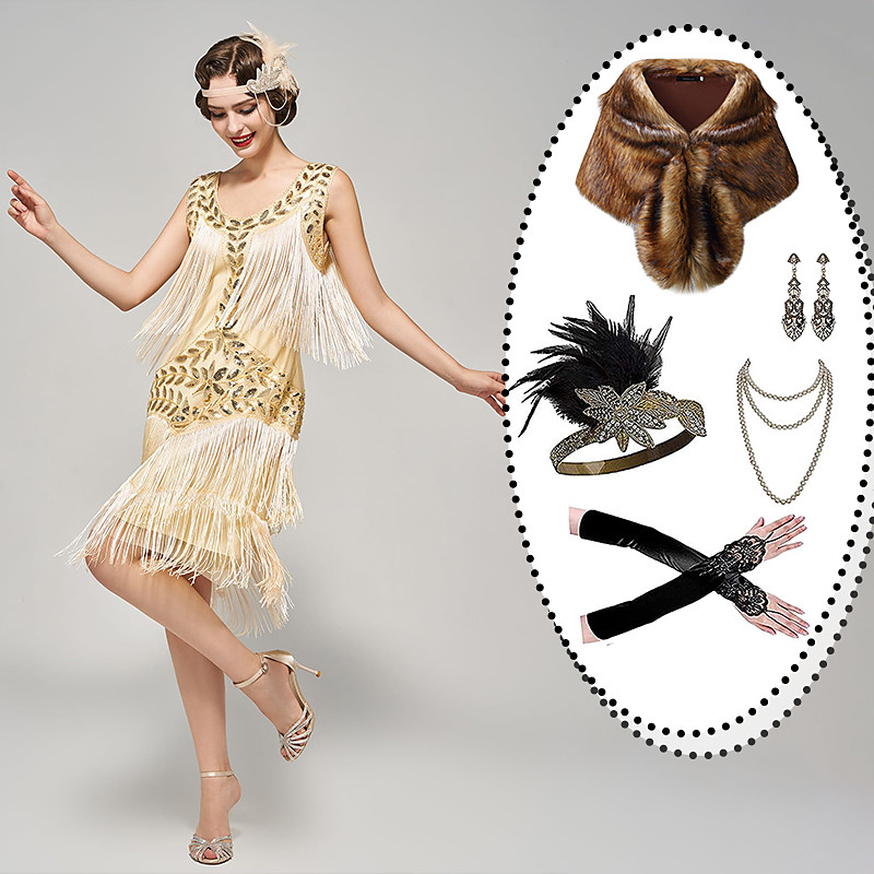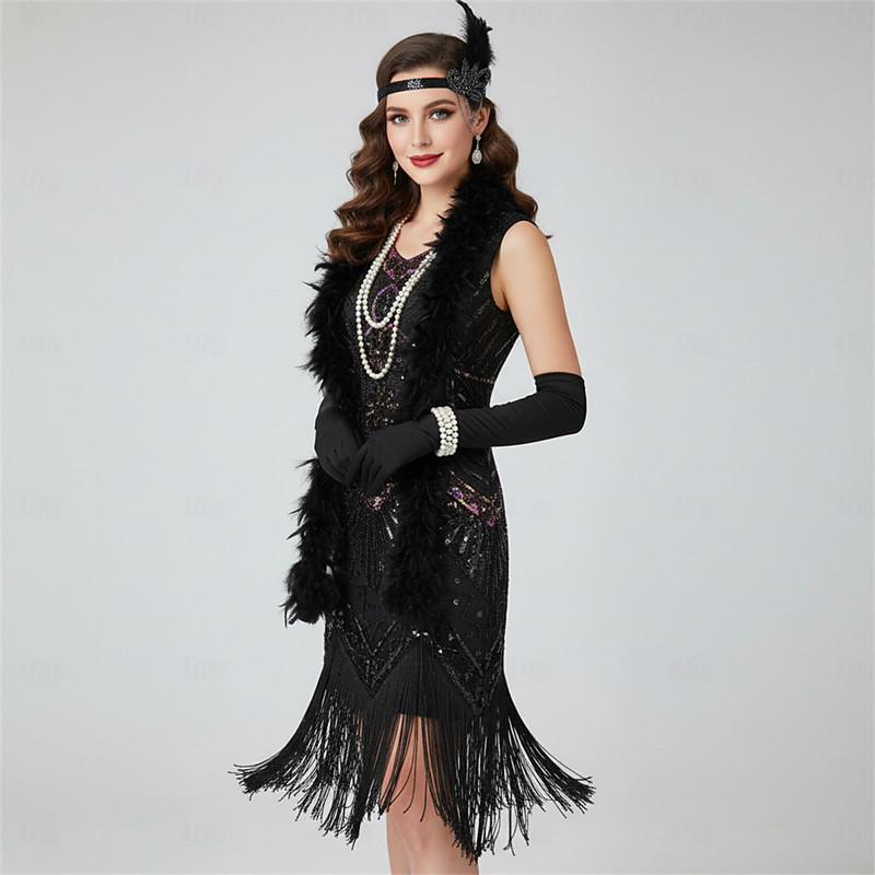 Set with Midi Flapper Dress Feather Headband Faux Fur Shawl Necklace Earings Long Opera Gloves Women's Roaring 20s 1920s Outfits Flapper Girl Cocktail Masquerade Party Carnival Sequin Costumes