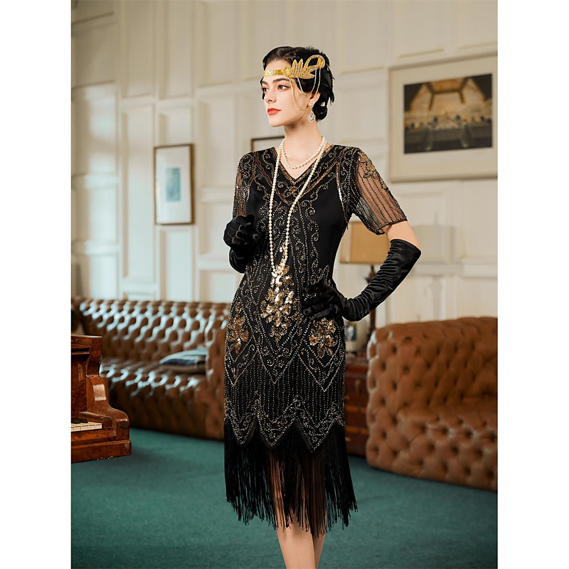 Roaring 20s 1920s Knee Length Flapper Dress Short Sleeves The Great Gatsby Flapper Girl Sequins Fringe V Neck Fancy Dress Women's Christmas Carnival Evening Party Masquerade Retro Theme Party Adults