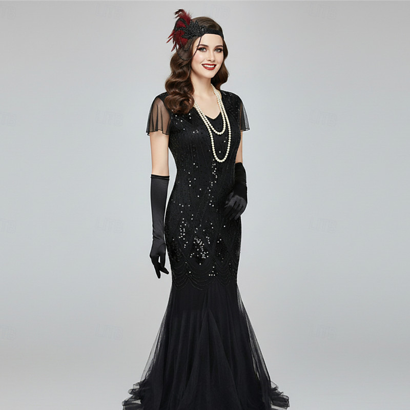 Roaring 20s 1920s Cocktail Dress Floor Length Dress Prom Dress Christmas Party Dress Normal Sleeveless The Great Gatsby Charleston Wedding Guest Sequins V Neck Fancy Dress Women's Wedding Event