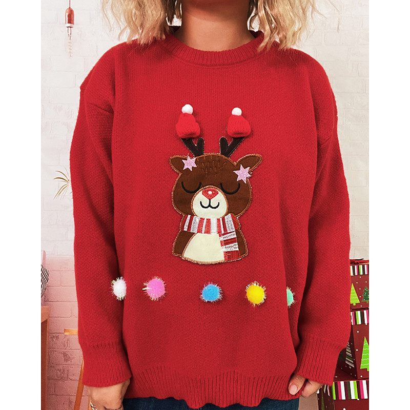 Women's Sweater Pullover Pom Poms Ugly Christmas Gifts Fashion Reindeer Ribbed Crew Neck Knitted Long Sleeve Regular Tops Knit Christmas Outdoor Holiday Black White Fall Winter