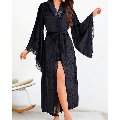 Per donna Accappatoio Casual Morbido Raso Colore Puro Pizzo Patchwork Quotidiano Casa Da letto Manica Lunga Scollo a V Nero Bianco Vino Estate Primavera Vestibilità comoda