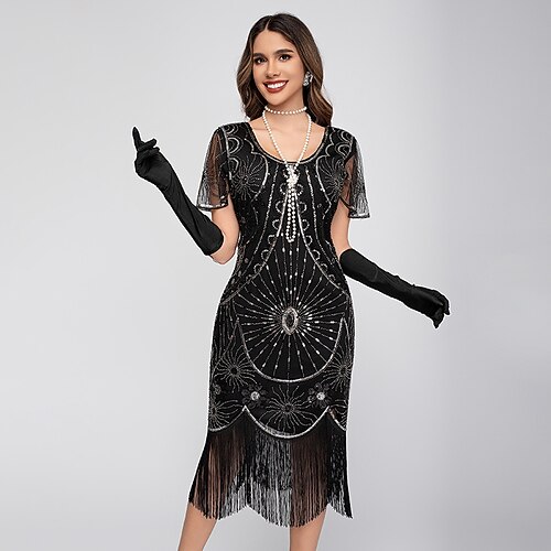 Anni Ruggenti Anni 1920 Midi Abito Flapper Maniche corte Il grande Gatsby Ragazza Flapper Paillettes Frange Tubino / Colonna Scollo a V Costume Per donna Natale Carnevale Mascherata Festa a tema