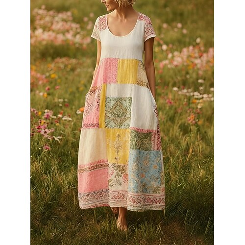 Per donna Abito lungo maxi Abito Boho Vestito Casual Vintage Quotidiano All'aperto Spiaggia Vestibilità comoda Floreale Manica Corta Collo a U Giallo Estate Primavera