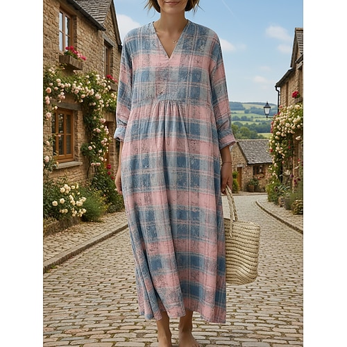 Per donna Abito Midi Vestito Casual Abito a Tubino Vintage Quotidiano All'aperto Vacanza Vestibilità comoda Plaid Manica Lunga Scollo a V Blu Estate Primavera Autunno