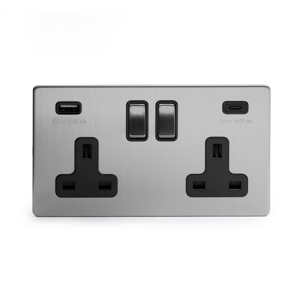 Soho Lighting Brushed Chrome 2 Gang USB A + C Socket (13A Socket + 2 USB Ports A+C 3.1A)