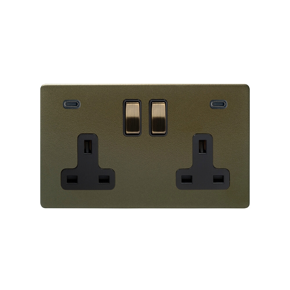 Soho Lighting Matt Black & Brushed Brass 2 Gang 65W USB C+C Socket (13A Socket + 2 USB C Ports) - Size: 86mm x 146mm x 4.5mm