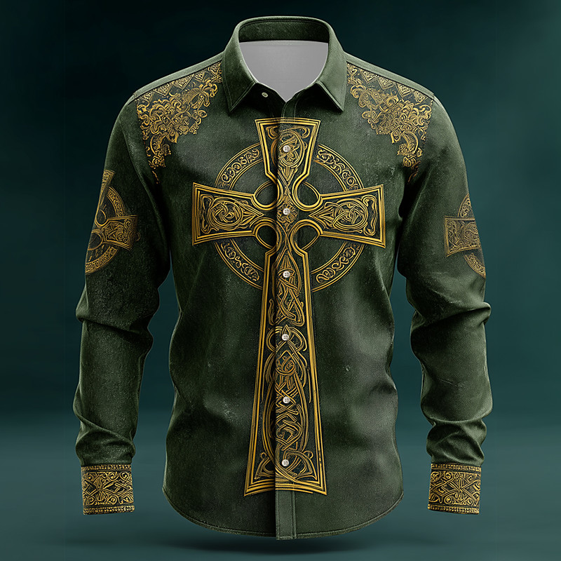 St. Patrick's Day Men's Four Leaf Clover Shamrock Celtic Cross Shirt Button Up Shirt Long Sleeve Vintage Retro Party Holiday Spring Fall Turndown 3D Print Linen Like Shirt Green 1# Green 2# Green