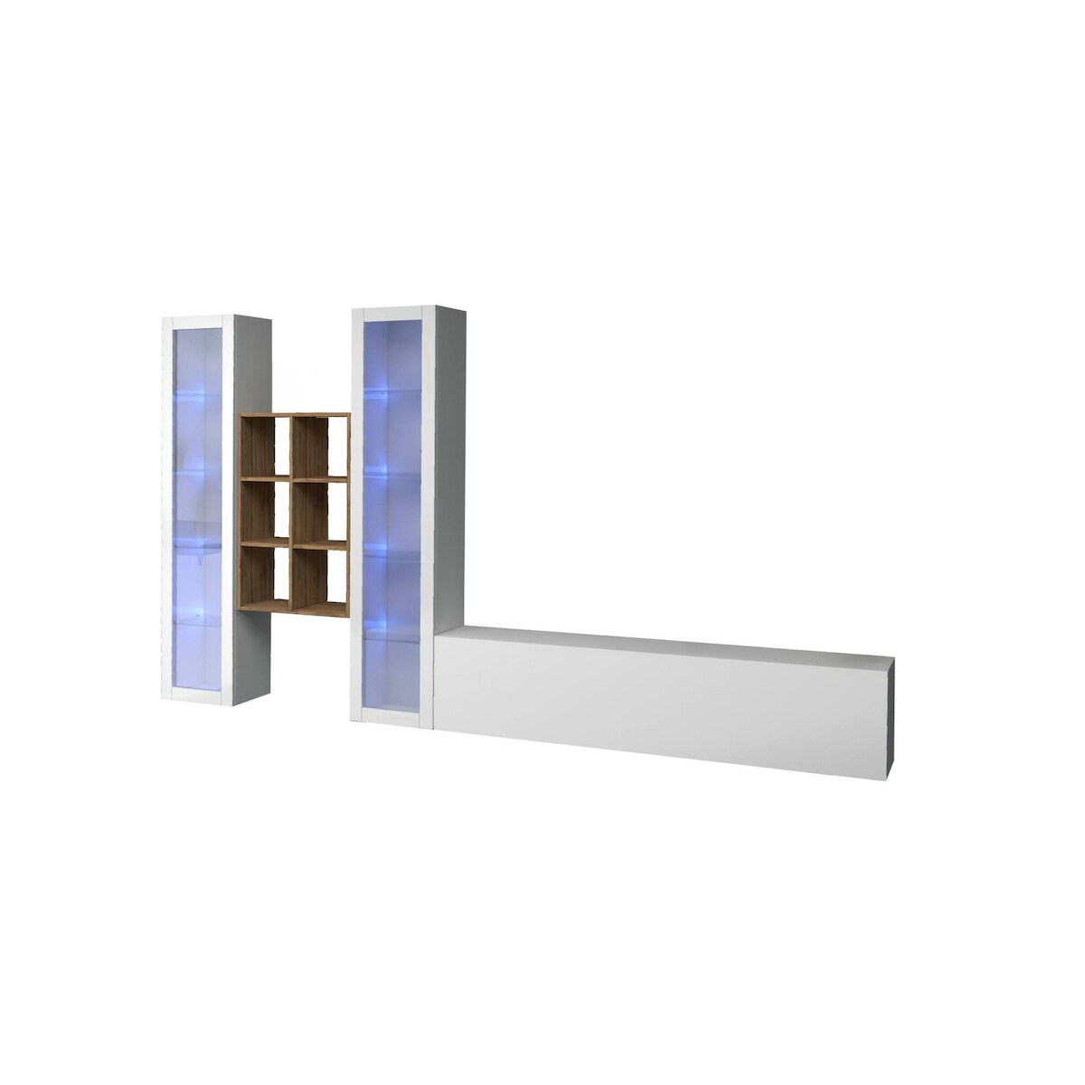 Dmora Wohnzimmermöbel Eros, Wohnzimmer-Set TV-Möbel mit 3 Türen, Mehrzweck-Wohnmöbel mit Vitrine und LED-Licht, cm 320x30h180, glänzend weiß