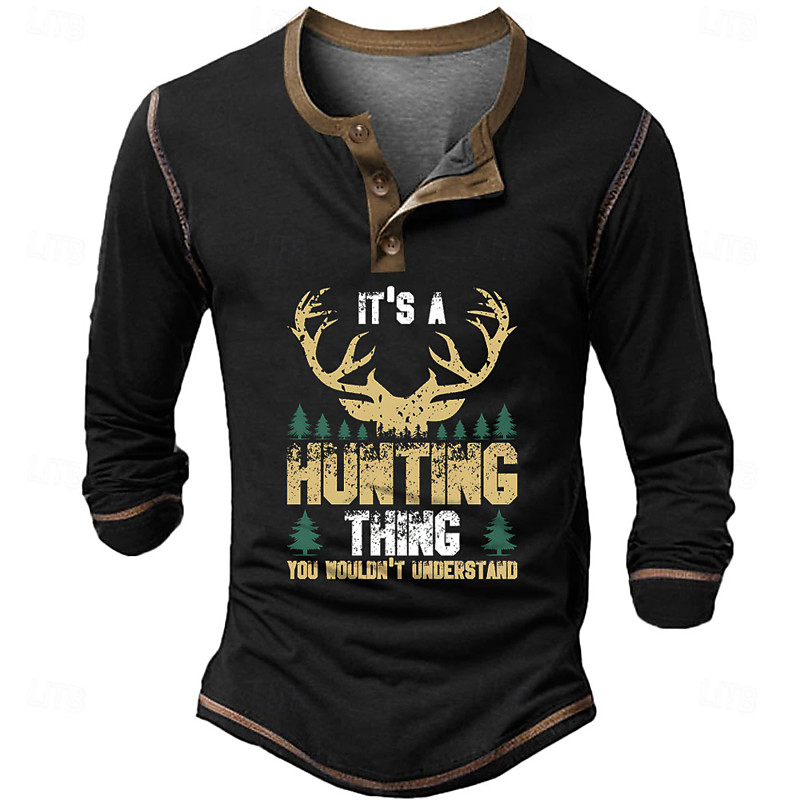 Men's Letter Print Deer Henley Shirt Long Sleeve 3D Print Cowboy Casual Holiday Going out Summer Spring Fall Black Navy Blue Army Green Henley Henley T-Shirt