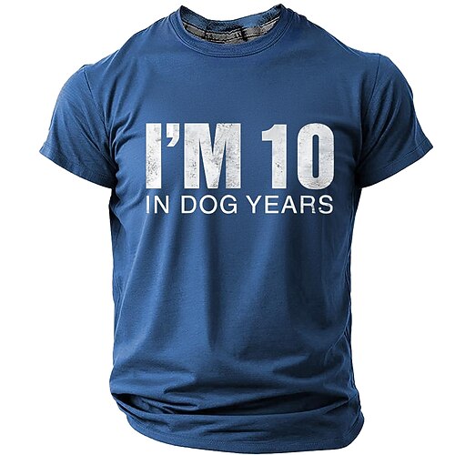 Herren-T-Shirt mit Aufdruck „Ich bin 10 in Hundejahren", abgenutztes Weiß, große, fette Buchstaben, humorvoll, sarkastisch, Gag-Geschenk, minimalistisch, Vintage, Grunge, normale Passform, lässig,