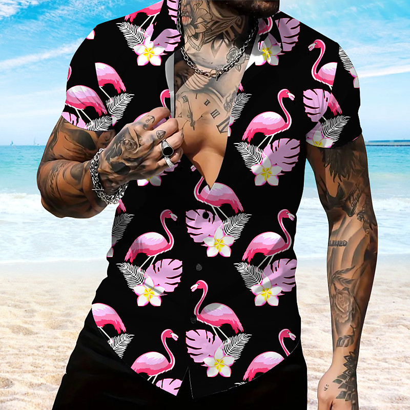 Men's Flamingo Beach Shirt Aloha Shirt Short Sleeve Hawaiian Vacation Summer Spring Turndown Button Up Black Gray