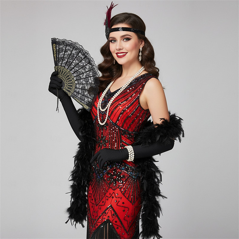 Set Roaring 20s 1920s Cocktail Dress Knee Length Flapper Dress Dress Outfits with Accessories Sleeveless The Great Gatsby Charleston Wedding Guest Sequins Tassel Fringe Feather V Neck Fancy Dress