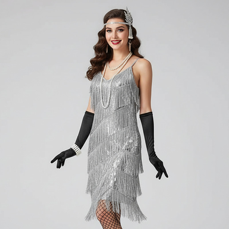 Set Roaring 20s Vintage Inspired The Great Gatsby Knee Length Short Length Flapper Dress Dress Outfits with Accessories Sleeveless The Great Gatsby Wedding Guest Sequins Tassel Fringe Sequin V Neck