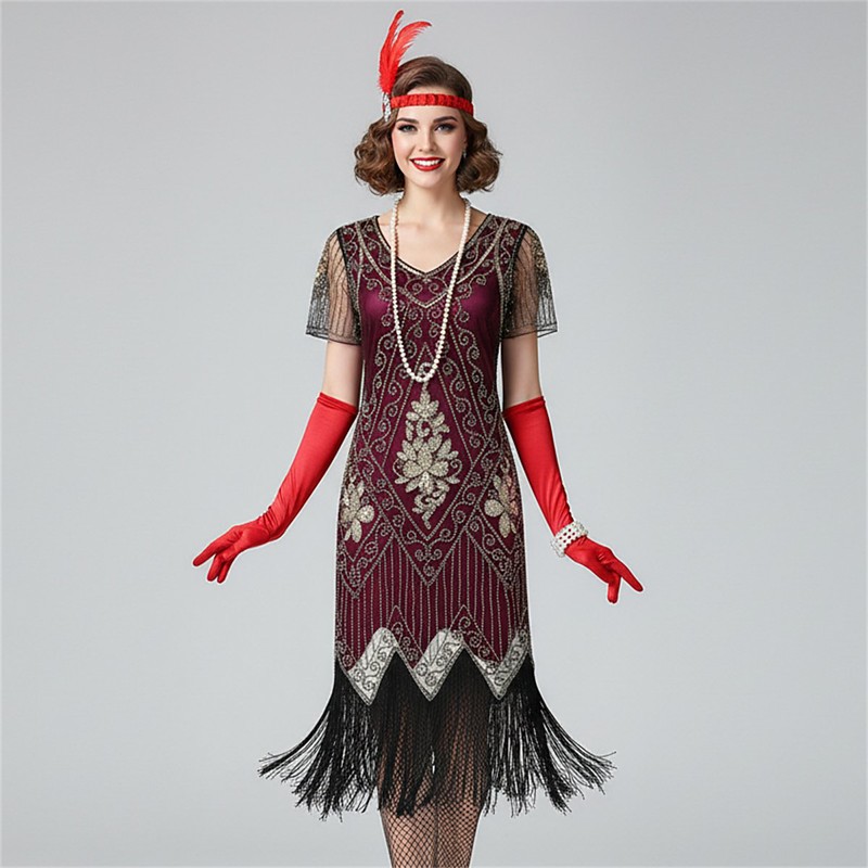 Retro Vintage Roaring 20s 1920s Knee Length Flapper Dress Dress Outfits Short Sleeves The Great Gatsby Wedding Guest Sequins Tassel Fringe V Neck Fancy Dress Women's Christmas Carnival Masquerade