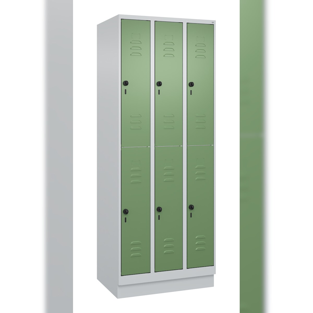 C+P Spind Classic PLUS, Sockel, 6 Abteile, HxBxT 195x75x50cm, Sicherheitsdrehriegel, Hellgrau/Resedagrün von PROREGAL