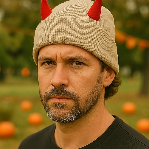 Unisex-Halloween-Teufelshorn-Beanie-Mütze – gestrickte warme Totenkopfmütze mit 3D-Hörnern für Männer und Frauen, Cosplay-Partykostüm und Outdoor-Bekleidung
