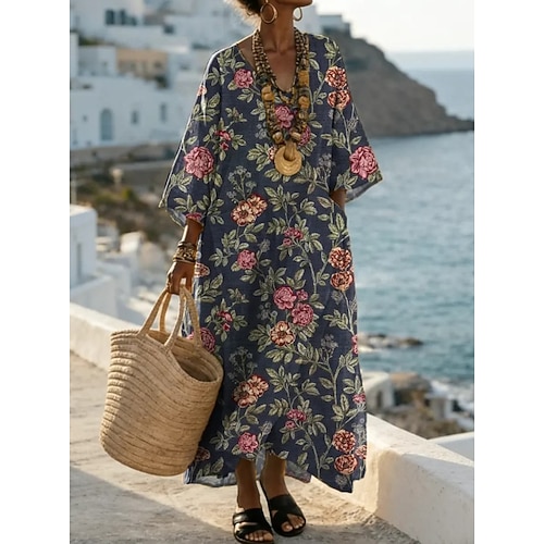 Per donna Abito maxi Abito a Tubino Vacanza Casual Spiaggia Uscire Vestibilità comoda Floreale Grafico Manica Lunga Scollo a V blu navy Rosa Beige Estate Primavera