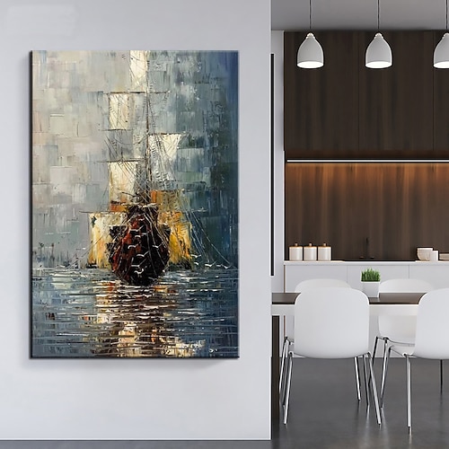 reines handgemaltes schwarzes blaues Spitzenboot-Wikingerschiff-Ölgemälde an den Wohnzimmerwänden des Gemäldes „Segeln des Sonnenuntergangs"-Gemäldewanddekoration für moderne gelbe Spitzenkunstwerke