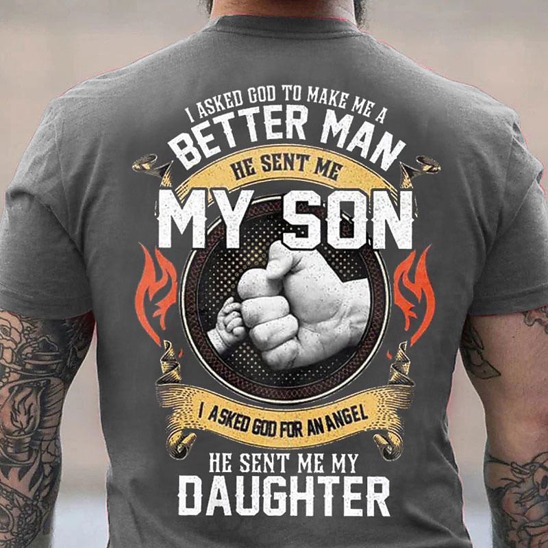 Mens Dad Graphic Tee: 'God Made Me A Better Man With My Son, My Daughter My Angel' Short Sleeve Family T-Shirt