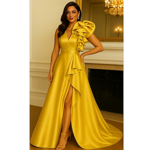 Abito da sera A-Line elegante formale lungo fino al pavimento senza maniche scollo a V tasca in satin con tasca
