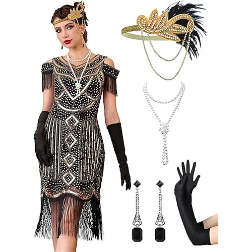 Set Anni Ruggenti Anni 1920 Abito da cocktail Lunghezza al ginocchio Abito Flapper Vestito Abiti con accessori Spalle scoperte Maniche corte Il grande Gatsby Charleston Paillettes Frangia con nappe