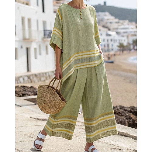 Completo da donna elegante alla moda streetwear in finto cotone e lino, due pezzi, pantaloni, mezza manica, girocollo, a righe, con coulisse, casual, quotidiano, all'aperto, blu, bianco, rosso, estivo, vestibilità ampia