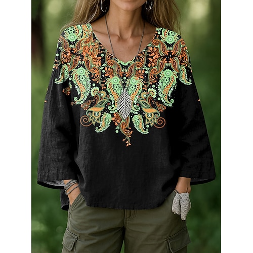 Per donna Blusa Floreale Grafico Geometrico Bohemien Vintage Hawaiano Manica Lunga Scollo a V Top Regolari Arricciato Stampato Nero Bianco Verde Estate Primavera