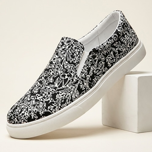 Sneakers casual slip-on da uomo nere e bianche stampate, leggere e comode, scarpe da passeggio basse alla moda per l'uso quotidiano, i viaggi, gli outfit del fine settimana, lo streetwear e il tempo libero all'aperto.