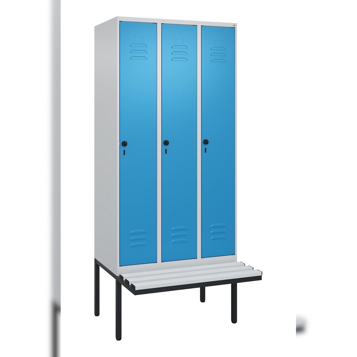 C+P Spind Classic PLUS, Kunststoff schwebende Sitzbank, 3 Abteile, HxBxT 212x90x82cm, Sicherheitsdrehriegel, Hellgrau/Lichtblau von PROREGAL