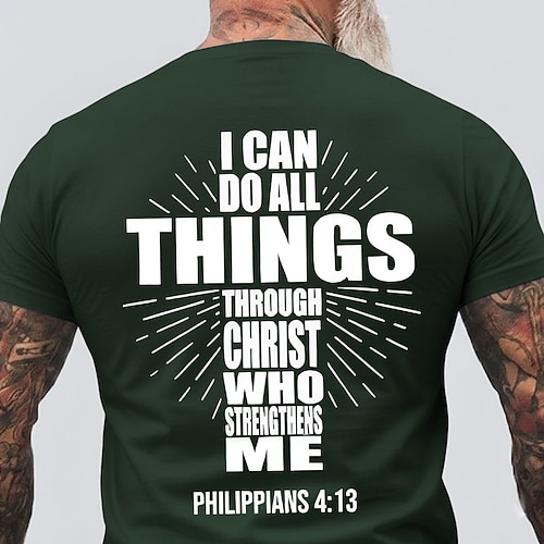 Herren-T-Shirt mit Kreuzmotiv und inspirierendem Spruch: „Ich vermag alles durch den, der mich stärkt" (Philipper 4,13). Das Shirt mit Rundhalsausschnitt und normaler Passform ist in den Größen S bis