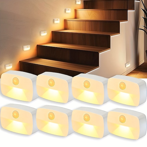 8 luci notturne a LED intelligenti con sensore di presenza, alimentate a batterie AAA, ideali per armadi, bagni, camere da letto, scale, guardaroba, corridoi e cucine.