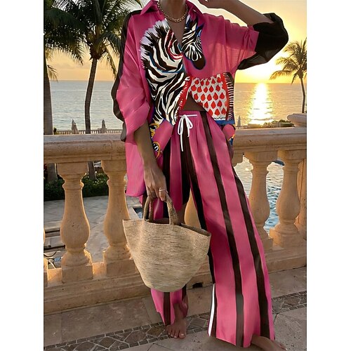 Per donna Set di Pantaloni Bolero Top Manica Lunga Colletto a Camicia Geometrico Moda Streetwear Quotidiano All'aperto Spiaggia Blu Rosa Rosa scuro Estate Vestibilità comoda
