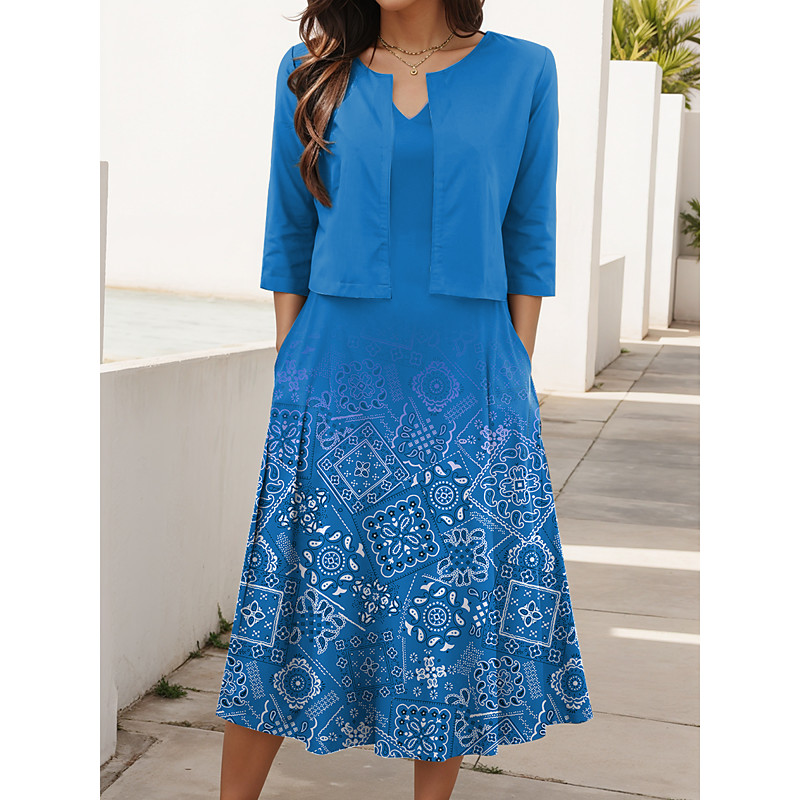 Women's Two Piece Dress Sets Midi Dress with Jacket Elegant A Line Dress Half Sleeve Casual Semi Formal Ombre Geometric Print V Neck Date Light Green Red Blue Regular Fit