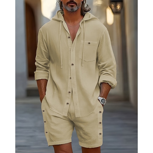 Per uomo Camicia di lino Completi T-shirt Outfit 2 pezzi Maglietta e pantaloncini Manica Lunga Con Cappuccio Estate Primavera Semplice Moda Casual 2 Pezzi Bottonato Vacanza Abbigliamento quotidiano