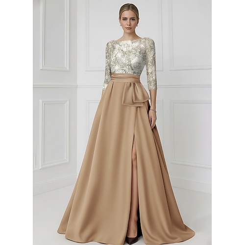 Linea ad A Lunghezza al pavimento Perline ricamate Abito Formale Abito da madre della sposa Abito da Sera Elegante Spacco Alto Manica 3/4 Girocollo Matrimonio Formale Raso Con Paillettes con