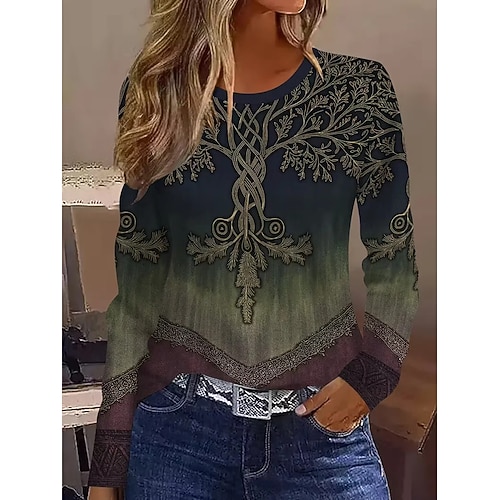 maglietta boho da donna con grafica e piante, alla moda, elegante, classica, a maniche lunghe, girocollo, normale, stampa quotidiana, verde erba, estate, primavera, autunno, inverno