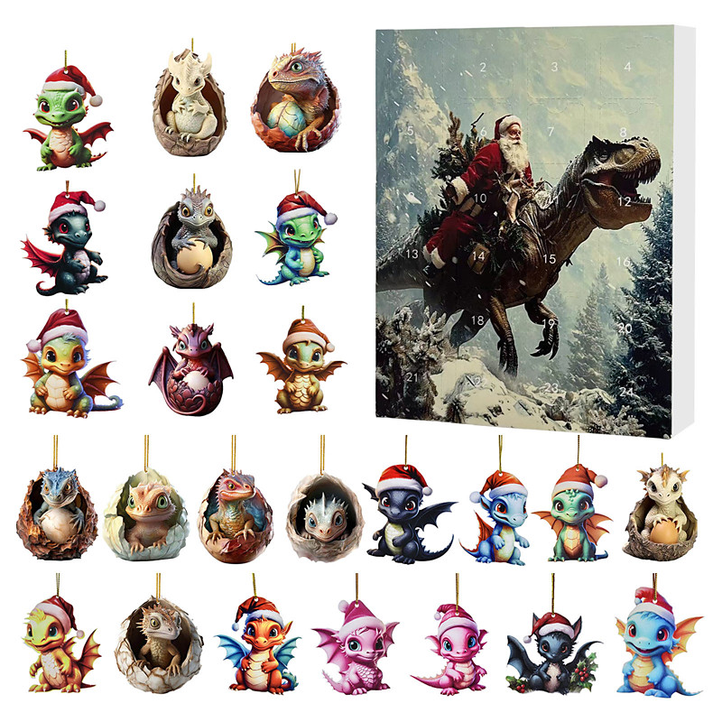 Christmas Advent Calendar Ornaments,2D Acrylic Cute Dragon Baby 24pcs Christmas Ornament Kit Gift 24 Days Countdown Mini Hanging Tree Xmas Ornaments for Christmas Party Decorations