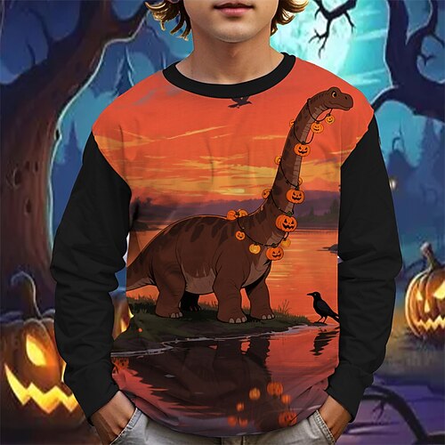 Halloween Jungen 3D Cartoon Kürbis Dinosaurier T-Shirt Langarm Frühling Herbst Mode Basic Kinder 4-12 Jahre Rundhalsausschnitt Outdoor Lässig Täglich Normale Passform