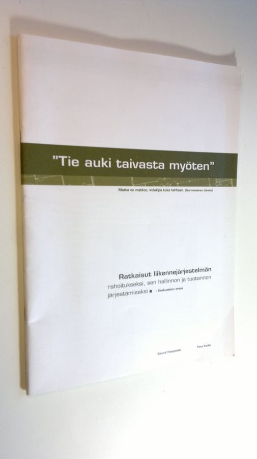 Tie auki taivasta myöten - Ratkaisut liikennejärjestelmän rahoitukseksi, sen hallinnon ja tuotannon järjestämiseksi