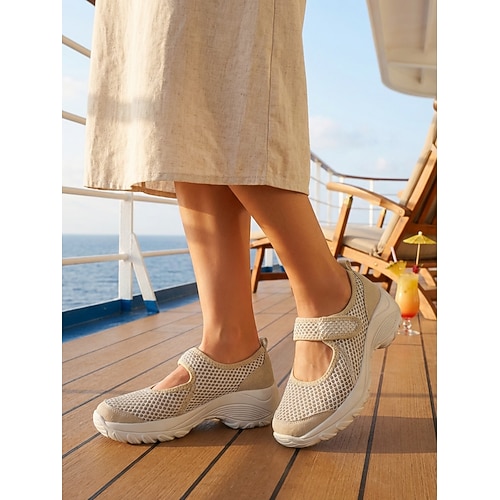 Scarpe basse Mary Jane da donna in rete beige: scarpe comode, traspiranti e leggere con cinturino regolabile e suola antiscivolo, scarpe casual da passeggio per viaggi, giardino e uso quotidiano.