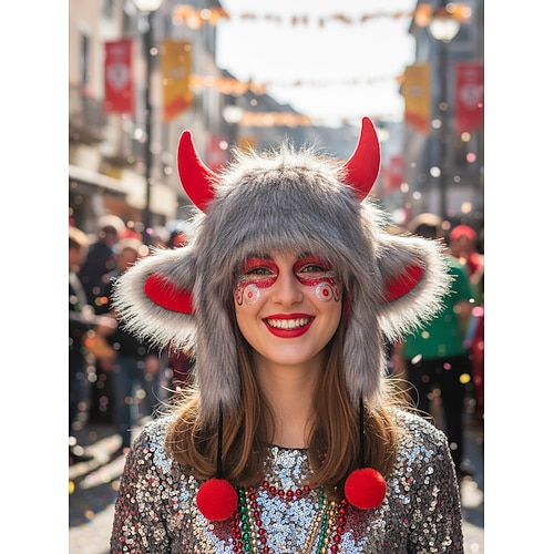 Schwarzer und roter Teufelshörnerhut für Damen mit Bommeln – lustiger, flauschiger Kostümhut für Karneval, Festivals und Themenveranstaltungen