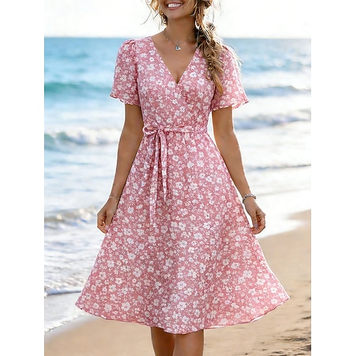 Per donna Vestito longuette Abito casual Abito linea A Moda Informale Da mare Giornaliero Standard Floreale Manica corta A V Bianco Rosa Rosso Azzurro Estate